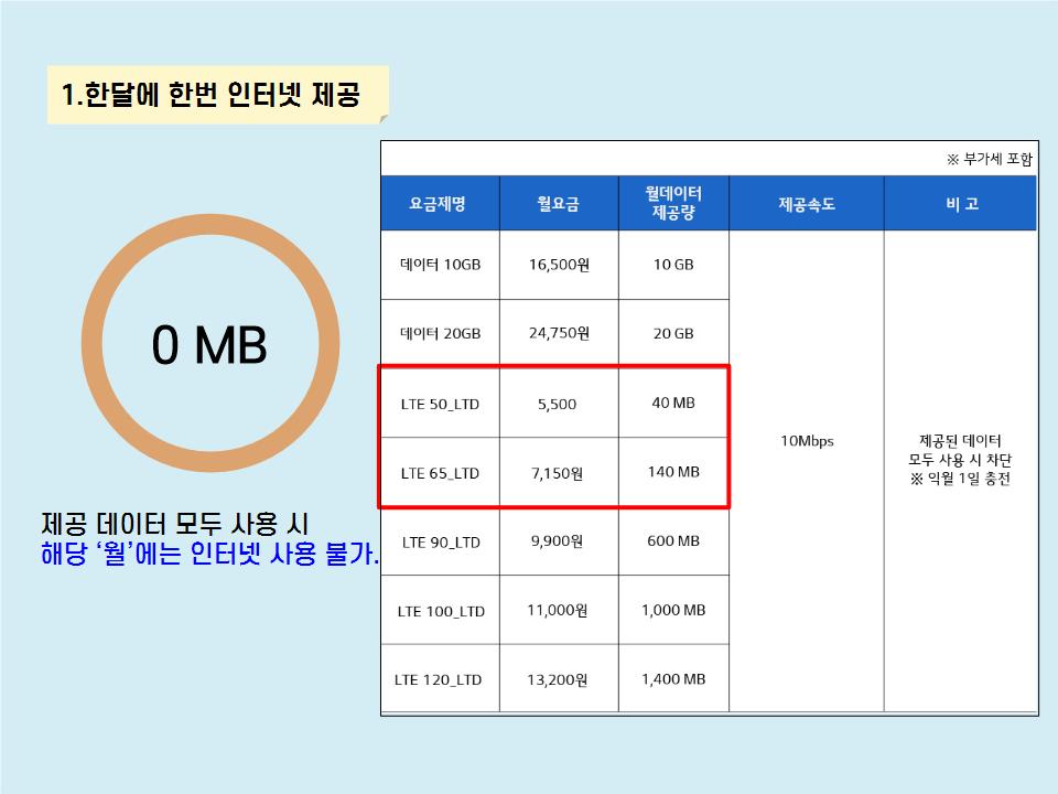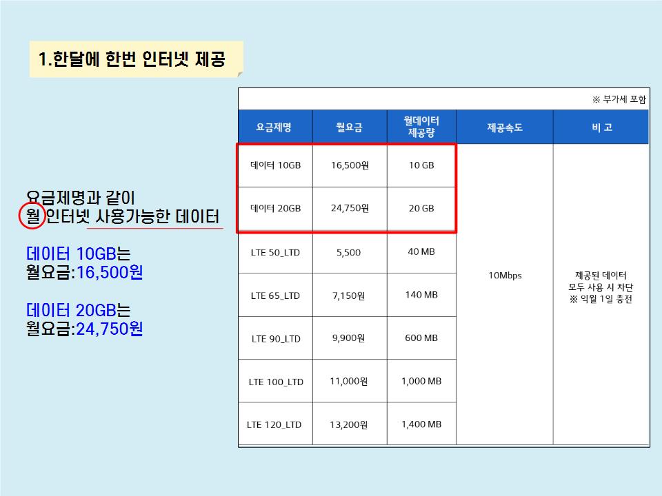 첫 번째 LTE라우터, '한 달에 한 번' 인터넷 데이터를 제공을 설명드리겠습니다. 표를 보시겠습니다.